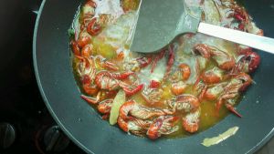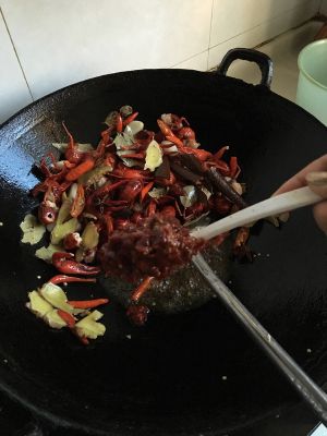 姜葱蒜爆炒后,加入小龙虾爆炒,待变色后再炒五分钟加入清水,妈妈市场买的小龙虾去了肠子和头部,其实应该买活的回来用盐水让龙虾自己清理一会儿,不过处理后龙虾这样吃起来比较方便,但是也要用盐水反复洗,这点很重要!