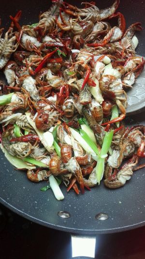然后方入小辣椒,生姜,大蒜,大葱,香菜骨爆香,倒再倒入小龙虾,翻炒一会,加入开水,然后加入盐,鸡粉,生抽,蚝油,大火收汁即可,装盘摆盘