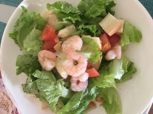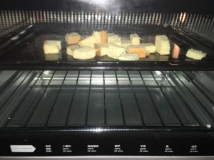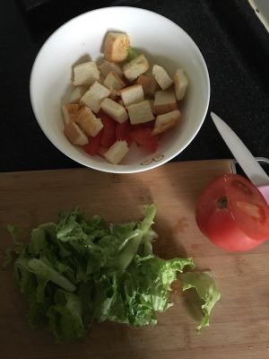 各种蔬菜切块,有牛油果也可以放,随意搭配白煮蛋弄熟剥壳切块。面包切块放烤箱180度烤3分钟