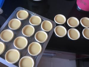 蛋挞皮解冻20分钟,放入黄桃再放入8分满的蛋挞水、