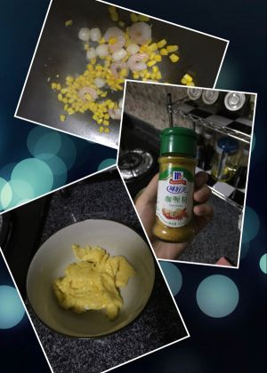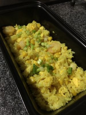 将玉米、扇贝柱、虾仁、鸡蛋、米饭撒上咖喱粉炒匀后装入容器。依据个人口味可以撒一些葱段。