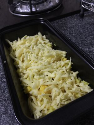 将饭铺在烤盘上,放马苏里拉芝士,我家只有这点了,所以不太好看。180度10分钟。