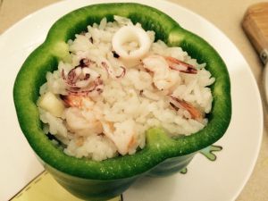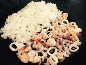土豆泥做好了,饭也摊凉了;1.热少许油(有橄榄油最好)拍几颗大蒜爆香;2.加入虾和鱿鱼翻炒,期间加少许盐调味;3.加入米饭,一起炒均