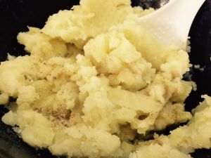 饭好了打开摊凉,现在取一碗放土豆,加10克左右的黄油,少许盐和黑椒粉,搅拌均匀,如果非常浓稠搅拌不了,加少许凉开水(不用多,约一调羹的量)