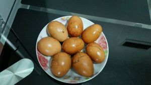 将敲出裂痕的鸡蛋,放入调好味的茶叶水中,大火煮开,转小火加盖焖煮约半个钟即可。(嗜辣者也可再添加红辣油浇上去)