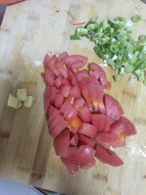 1:葱切沫葱最好用香葱味道香些,姜切片或者丝,西红柿切小块备用