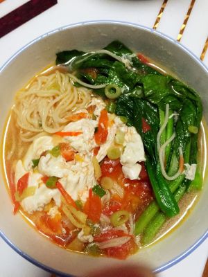 放入适量汤水让番茄汁释放,最后放入面煮开即可。放入葱花