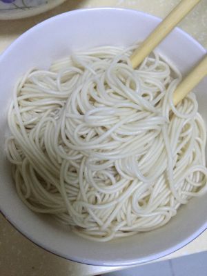 水烧开把面条放进去过水一分钟捞出放到碗里备用(面条放进去后用筷子一直搅拌以免粘锅)