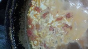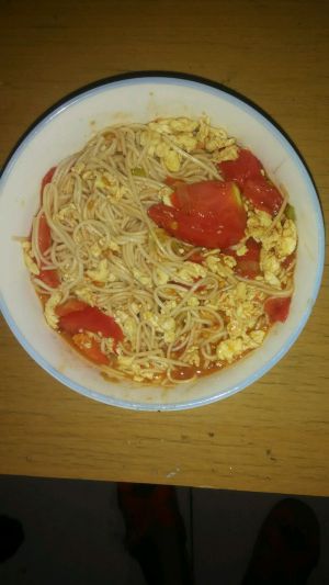 锅中热油把鸡蛋炒熟,铲出,在热油把西红柿炒出水,加入鸡蛋翻炒一下,之后加水,水开放入盐少许,调味,之后放入面条,大约煮个4-5分钟,即可出锅