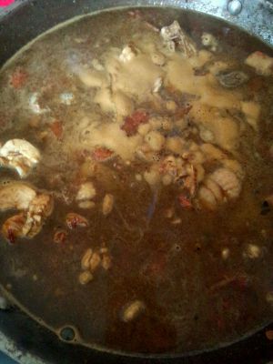 后放入黄酒,我放了大半瓶,一是去腥二是入味,可加水也可不加水。再倒点酱油蚝油后大火烧开。
