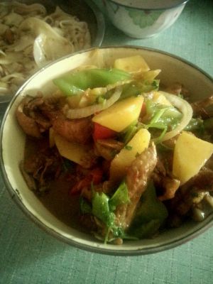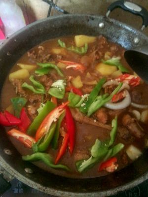15分钟左右,可以下切小块的土豆。煮5分钟左右,加入柿子椒,盖盖儿,一分钟,关火,用余温再焖一下柿子椒。