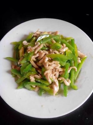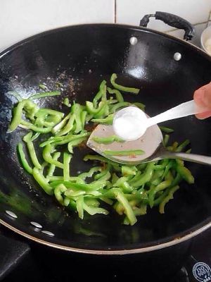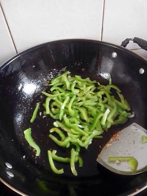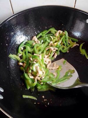 肉丝倒下去一起炒,有点干的话,可以加点水,炒到青椒熟了就可以出锅了