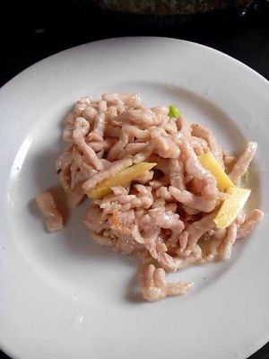 肉丝倒入热油锅加适量盐和姜翻炒至变色盛盘备用
