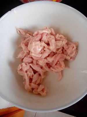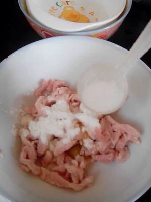 洗干净的肉丝,用生粉,芝麻油,盐腌制十分钟左右