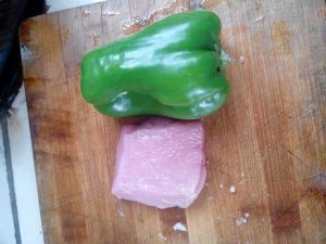 青椒洗干净,切块装碗里。生姜洗干净,切片;蒜头去皮,拍扁;将其一起装在碗里备用。