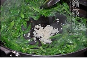 将青椒丝划到锅边,炒锅中央浇上少许油,将蒜茸、豉茸倒入锅中间中小火煸香;将青椒丝一同翻炒;