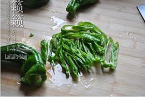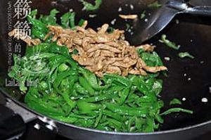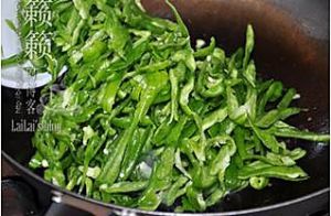 锅内留底油,烧至五成热,放入青椒丝翻炒,同时下盐。青椒丝受热,粘盐后“吐”出的“涩水”滗去不要;
