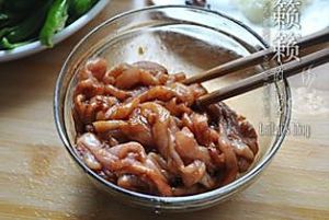 准备食材:葱蒜切末,青椒切丝,五花肉切条,放到碗里加生抽、老抽、白糖、料酒,用量不用多,半盖子就行,用手抓匀,腌制15分钟