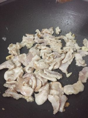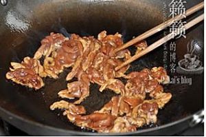 将炒锅烧热,注入适用油,油温起来后将腌制好的肉丝放入炒散,盛出备用;