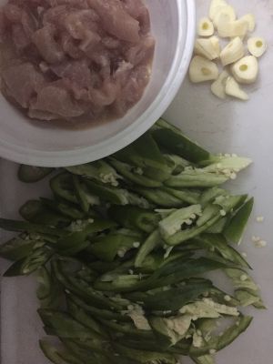 瘦肉洗净切片,用适量生粉酱油盐腌瘦肉(10分钟),青椒切条,切点蒜头