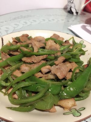肉放盐料酒腌制,锅里放少许油,小火扁炒五花肉至金黄盛出,再把青椒放进去炒变色后放一点盐调味,倒入肉一起炒,放味精起锅