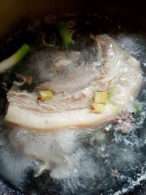 五花肉加料酒,姜片,八角,香叶煮20分钟。