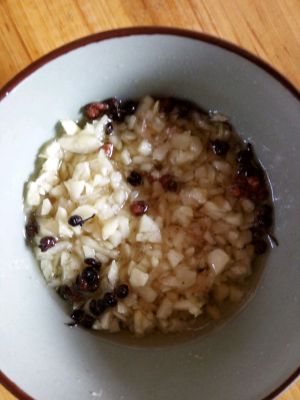 肉焯好后开始准备调料,锅中倒入油,放入花椒,烧至冒烟说明油热了,立即倒入备好蒜末的碗中