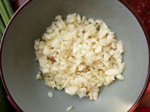 准备好一整个大蒜,剥皮后拍扁,然后剁碎,放入小碗中