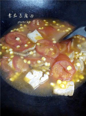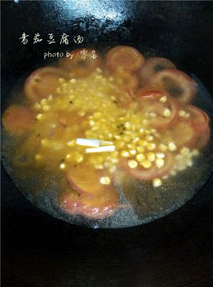 倒入热水,盖锅煮两三分钟倒入豆腐 ,水没过豆腐,再加番茄酱和少量糖,量适个人口味定