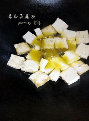 炒锅置火上,倒入适量植物油烧热,将豆腐块放进锅里小火煎至两面变黄后,捞出;
