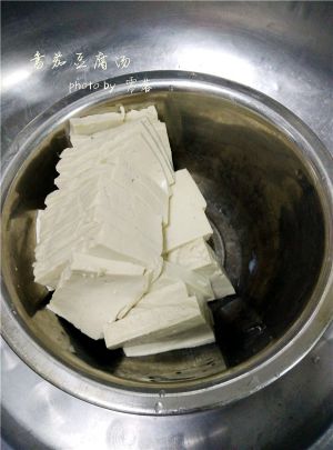 把豆腐切成2厘米左右的方块,锅里放清水,把豆腐放到水里开大火烧开,待豆腐稍微有点蜂窝状捞出,ps:捞出后要浸在冷水里,防止豆腐粘在一起。