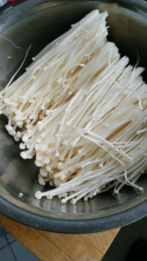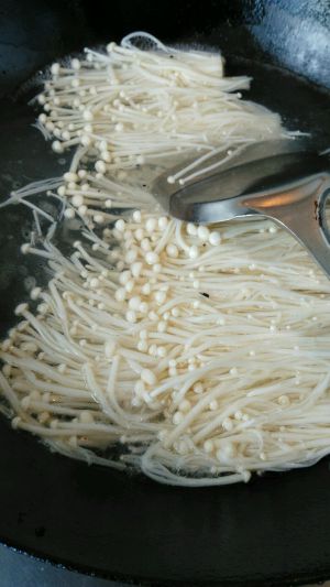 先把金针菇去根,焯水,煮透之后捞出备用(注:我喜欢捞到矿泉水中迅速给金针菇降温)