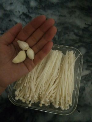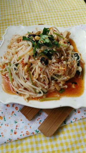 盛盘。好吃的金针菇配上自制老干妈,吃完口齿留香!
