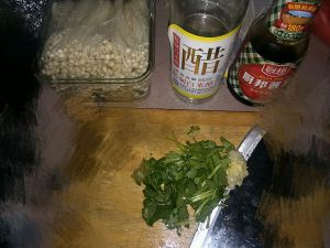 切香菜,剁蒜子,加白醋,加酱油,一起加到金针菇上。(上图的金针菇拍时还没倒水,加材料前记得倒水!!!)