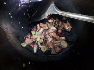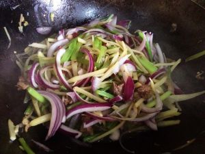 最后放洋葱,放盐及鸡精调味,还可再放点酱油,翻炒至断生即可