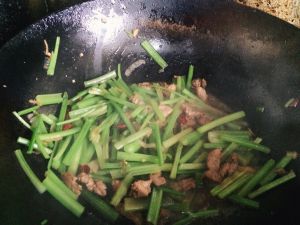 加入芹菜丝,炒一炒加入蒜末和盐!