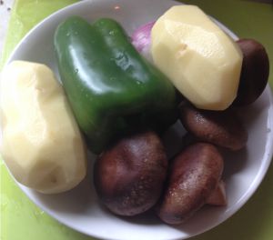 土豆削皮切块,青椒洗净切块,洋葱洗净切粒,香菇洗净撕块。