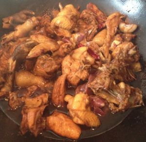 油锅加热,鸡块倒入翻炒3、4分钟,加入葱、蒜、干辣椒,直至炒香后倒入黄酒。
