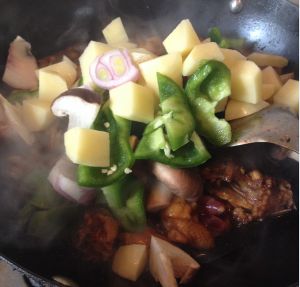 鸡炖的差不多了,放土豆和青椒,翻炒后加点水入味。这个时候基本就好了,就等土豆绵了。