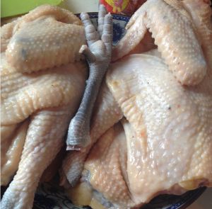 将鸡肉外理干净,去掉内脏(鸡肝和鸡胗留着),那些鸡头鸡爪还有鸡PP也扔掉,然后切小块备用,我用的是那种成鸡只有两斤左右的农家散养嫩土鸡,宰杀切块处理干净后,可用的鸡肉大概也只剩一斤多点了,肉质很嫩;