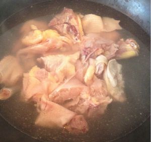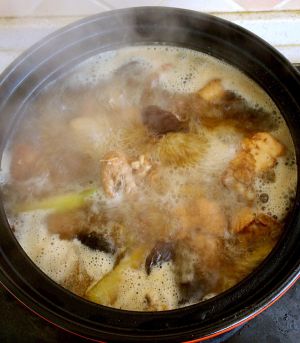 把砂锅里的食材,倒进砂锅里,放点鸡精,和少许醋,小火慢炖1个小时,快出锅时,大火在炖10分钟(目的是收汁)