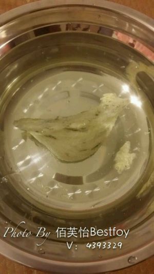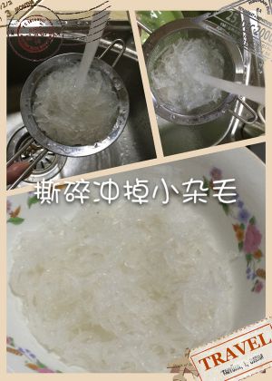 泡发后,将燕窝撕开,燕角比较难泡发开,可以拿手捏一下。燕脚撕开为片状。拿漏勺在流动水下冲洗下,过滤掉小细毛
