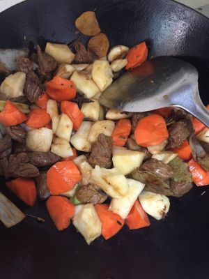 放入土豆胡萝卜翻炒片刻加入清水莫过他们!