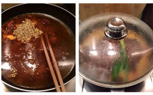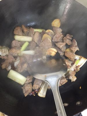 炒好的牛肉加水,喜欢口感软些的就多加点水,多炖一会,然后加入黄酒,老抽,小茴香,草果和八角,再加入一勺蒜蓉辣椒酱、姜片和一根整葱,大火烧开后,盖上锅盖小火慢炖约2小时