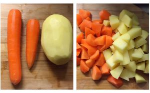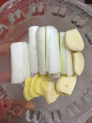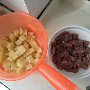 牛肉逆纹切麻将块,土豆胡萝卜切滚刀块,大葱切三段,姜切片