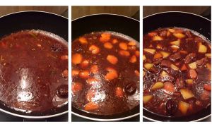 把土豆胡萝卜牛肉圆葱全部放进去,倒入酱油,翻炒片刻,放刚才煮牛肉的汤
