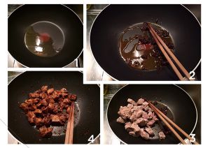 锅烧热,倒油关火,加入郫县豆瓣酱,热锅冷油将其炒出红油后开火,放牛肉翻炒均匀