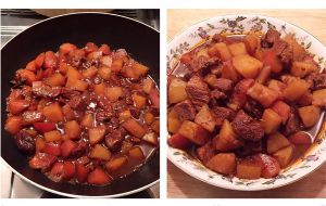 水炖到一半的时候,加入盐调味,糖提鲜,然后继续炖,水收至1/3时牛肉差不多牛肉就炖好了,之后从新加水到原先1/2处的位置,然后加胡萝卜块先炖10分钟,再放入土豆块一起炖到土豆和胡萝卜软了为止(因为我的土豆很容易炖烂,胡萝卜相对较硬,所以先单独炖一下胡萝卜,要是你的两样都很硬,那就一起下锅,要是水炖的差不多了,还没软,就继续加水炖)
