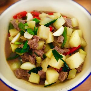 锅洗净,将牛肉倒入锅中,加入多种配料,辣椒,花椒,土豆块……翻炒后加入少量水,倒入酱油,收汁……我就是水放多了……而且没有老抽调不了色……最后快好了倒入蒜叶在闷一会……最后出锅。