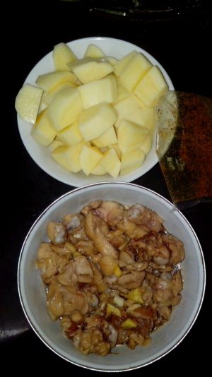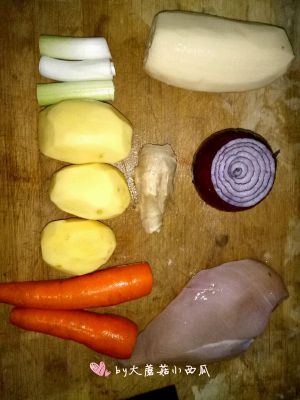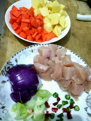 把鸡腿洗净斩切成块,放盐料酒略腌,士豆去皮切滚料块,洋葱、圆椒各切片,葱姜改小待用。